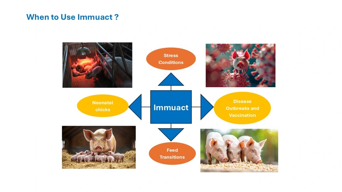 1.Immune Modulation: Immuact stimulate the immune system by activating macrophages, neutrophils, and natural killer cells, neutralised inflammatory cytokinin, leading to improved pathogen defence, thereby enhancing the animal's ability to fight infections. Nucleotides support rapid cell division and repair, crucial for the immune system. Propionic and butyric acids act as energy sources for intestinal cells and have anti-inflammatory properties, supporting immune health.