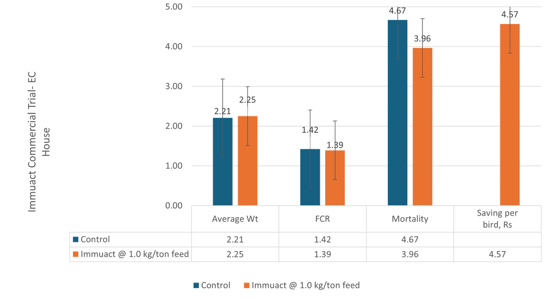 According to the trial conclusively shows that Immuact supplementation at 1 kg/ton of feed offers significant advantages in broiler production. The observed improvements in mortality, body weight, and FCR, along with the economic benefits, support the recommendation of Immuact as a valuable feed additive for enhancing broiler performance and profitability.