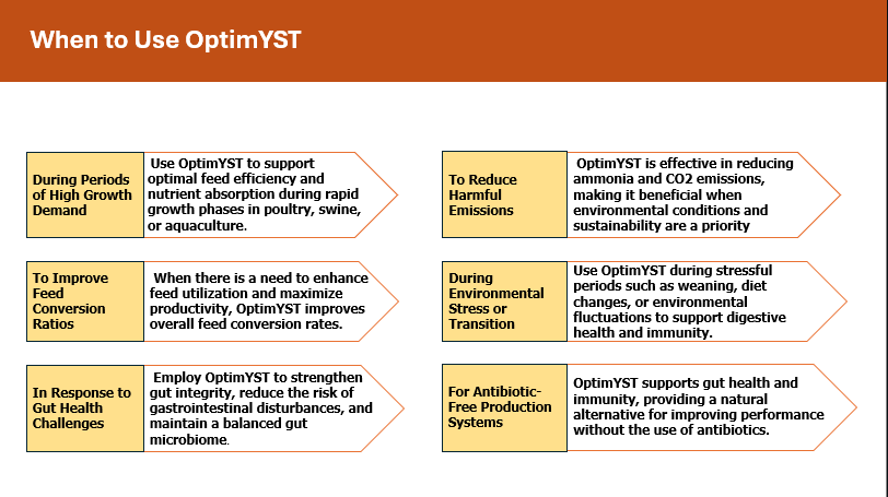 OptimYST revolutionises broiler poultry nutrition by optimizing gut health through a scientifically formulated blend. It promotes a balanced gut microbiota, enhancing nutrient absorption and maximizing feed efficiency for accelerated growth. By bolstering immune function and mitigating digestive challenges, OptimYST ensures robust health and vitality in every animal, translating to superior performance and profitability on your farm.