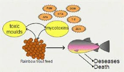 • Fishes: Mycotoxins compromise the immune system by reducing white blood cell counts and impairing antibody production, making fishes more vulnerable to bacterial, viral, and parasitic infections.